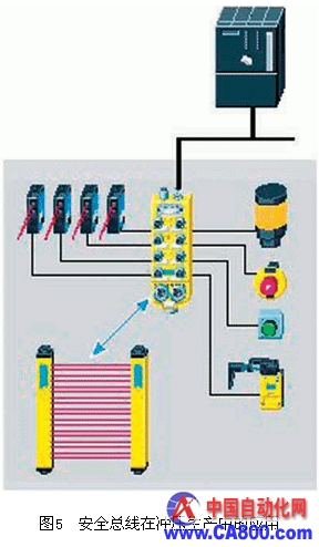 在全自動沖壓機的工作區(qū)域,通常會安裝機械式安全圍欄、安全門鎖、帶屏蔽傳感器的安全進出入口安全光柵及急停開關(guān)等安全傳感器。這些安全保護設(shè)備通過“安全總線接口”連接到安全總線系統(tǒng)中去(如圖5所示)。