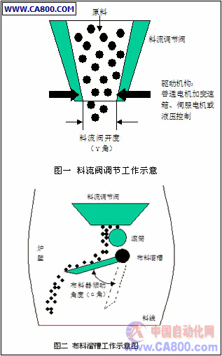 現(xiàn)代化的高爐為了最大限度的提高冶煉效率,均采用了料流調(diào)節(jié)閥加布料溜槽的控制方式來實(shí)現(xiàn)礦、焦在爐內(nèi)的精確布料,料流調(diào)節(jié)閥和布料溜槽控制布料的原理如圖一和圖二所示。