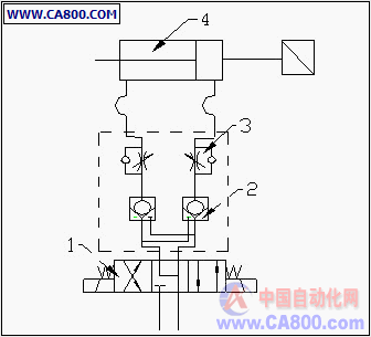 1 換向閥 2 液控單向閥 3 單向節(jié)流閥 4油缸