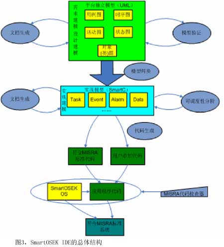 SmartOSEK IDE是面向汽車電子應(yīng)用、支持SmartOSEK操作系統(tǒng)的集成開(kāi)發(fā)環(huán)境。它充分借鑒了基于模型驅(qū)動(dòng)的設(shè)計(jì)思想,圍繞汽車電子軟件開(kāi)發(fā)領(lǐng)域V字型流程,提供UML需求建模、SmartC算法建模、狀態(tài)圖模型驗(yàn)證、系統(tǒng)可調(diào)度性分析、自動(dòng)代碼生成、自動(dòng)文檔生成等一整套開(kāi)發(fā)工具鏈。SmartOSEK IDE的總體結(jié)構(gòu)見(jiàn)圖3。