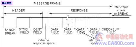 一個(gè)報(bào)文幀如圖 1-2所示,是由一個(gè)主機(jī)節(jié)點(diǎn)發(fā)送的報(bào)文頭和一個(gè)主機(jī)或從機(jī)節(jié)點(diǎn)發(fā)送的響應(yīng)組成。報(bào)文幀的報(bào)文頭包括一個(gè)同步間隔場(SYNCH BREAK FIELD)、一個(gè)同步場(SYNCH FIELD)和一個(gè)標(biāo)識(shí)符場。報(bào)文幀的響應(yīng)(RESPONSE)則由3 個(gè)到9 個(gè)字節(jié)場組成:2、4 或8 字節(jié)的數(shù)據(jù)場(DATA FIELD)和一個(gè)校驗(yàn)和場(CHECKSUM FIELD)。字節(jié)場由字節(jié)間空間分隔,報(bào)文幀的報(bào)文頭和響應(yīng)是由一個(gè)幀內(nèi)響應(yīng)空間分隔。最小的字節(jié)間空間和幀內(nèi)響應(yīng)空間是0,這些空間的最大長度由報(bào)文幀的最大長度TFRAME_MAX。