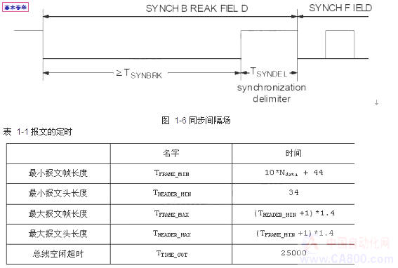 同步間隔場的顯性電平長度至少為TSYNBRK(可以更長),這個(gè)時(shí)間是用主機(jī)位定時(shí)來測量。最小值應(yīng)根據(jù)連接從機(jī)節(jié)點(diǎn)指定的最小本地時(shí)鐘頻率所要求的閥值而得出。
