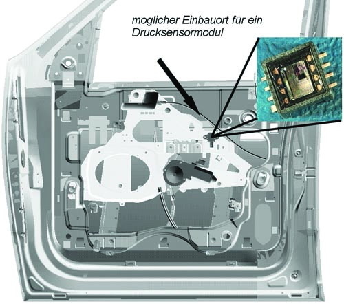 使用壓力傳感器探測側(cè)面碰撞的另外一個優(yōu)勢是整個門作為傳感元件,因為壓力在整個門的空間分布。相應(yīng)地,輸出信號也與獨立的碰撞點無關(guān),而是完全取決于沖擊力。這就帶來了另外一個關(guān)于傳感器定位和安裝技術(shù)的優(yōu)勢:壓力傳感器的輸出在很大程度上與這些因素?zé)o關(guān)。