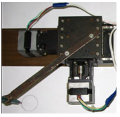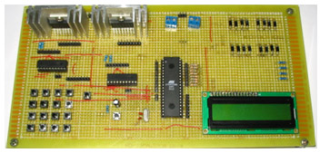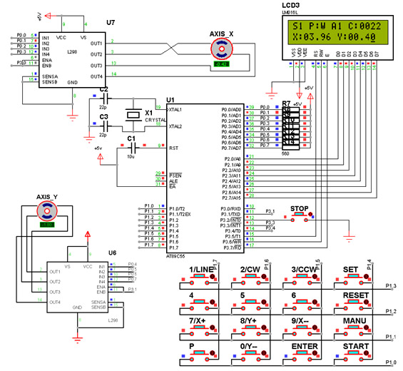 ![]() 圖4 步進電機控制系統(tǒng)硬件電路仿真 如圖4所示,單片機AT89C55司職步進電機控制器,通過運行在Keil uVision2 環(huán)境下所開發(fā)的程序來控制兩個步進電機驅(qū)動芯片L298,從而實現(xiàn)對AXIS_X / AXIS_Y兩軸步進電機的聯(lián)動控制。L298驅(qū)動芯片的步進脈沖輸入信號來自AT89C55 P0端口,使能信號ENABLE A與ENABLE B并聯(lián)接到AT89C55的P3.0、P3.1口,由程序控制實現(xiàn)步進電機的使能,從而避免電機線圈處于短路狀態(tài)而燒壞驅(qū)動芯片。4 x 4鍵盤陣列接AT89C55的P1端口,通過程序設(shè)計定義每個按鍵的具體功能。LCD的數(shù)據(jù)端口DB0~DB7接AT89C55的P2端口,控制端口RS, RW, E分別接單片機的P3.5, P3.6, P3.7口。相關(guān)的參數(shù)值、X/Y軸坐標值可以通過LCD以文本方式顯示。本文采用軟硬件協(xié)同仿真的方法經(jīng)過設(shè)計à測試à修正à再測試一次次迭代開發(fā),在制作控制系統(tǒng)硬件電路之前即可實現(xiàn)對系統(tǒng)整機功能的測試。待系統(tǒng)程序和硬件電路設(shè)計方案最終完善之后便可以實際制作如圖5所示的硬件電路。顯然該種方法可以顯著提高系統(tǒng)軟硬件開發(fā)的成功率,從而有效降低系統(tǒng)的開發(fā)周期和開發(fā)成本。 5 應(yīng)用實例 圖5即是根據(jù)圖4進行硬件電路仿真的最終結(jié)果所制作的步進電機控制系統(tǒng)電路板。該電路驅(qū)動X/Y軸步進電機通過滾珠絲桿帶動二維工作臺作聯(lián)動,并由一只鉛筆模擬加工刀具將所要加工的二維軌跡描繪出來。