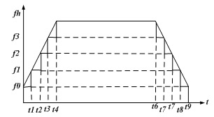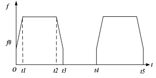 ![]() 圖1 圓弧軌跡示意圖 圓弧半徑: 終點坐標: 終點坐標相對X軸的角度: 本系統(tǒng)要求輸入的角度精確到1度,輸入坐標的分辨率是0.01,單片機C語言的浮點運算能精確到0.000001,按照上面的公式算出的終點坐標,雖存在誤差,但這個誤差小于1%,能夠滿足所要求的精確度。 3 步進電機的變頻調(diào)速 雖然步進電機具有快速啟停能力強、精度高、轉(zhuǎn)速容易控制的特點,但是在實際運行過程中由于啟動和停止控制不當,步進電機仍會出現(xiàn)啟動時抖動和停止時過沖的現(xiàn)象,從面影響系統(tǒng)的控制精度。尤其是步進電機工作在頻繁啟動和停止時,這種現(xiàn)象就更為明顯[2>。為此本文提出了一種基于單片機控制的步進電機加減速離散控制方法。加減速曲線如圖2 所示,縱坐標是頻率 f,單位為脈沖/秒或步/秒。橫坐標時間 t,單位為秒。步進電機以 f0 啟動后加速至 t1 時刻達到最高運行頻率 f,然后勻速運行,至 t2 時刻開始減速,在 t5 時刻電機停轉(zhuǎn),總的步數(shù)為 N。其中電機從靜止加速至最高運行頻率和從最高運行頻率至停止至是步進電機控制的關(guān)鍵,通常采用勻加速和勻減速方式。