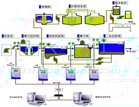 測(cè)控系統(tǒng)分為四個(gè)數(shù)據(jù)采集控制區(qū):曝氣沉沙池、初次沉淀池、曝氣池和二次沉淀池。 每個(gè)區(qū)域采用1~2臺(tái)SuperE RTU,檢測(cè)液位、溫度、PH值等參數(shù),控制水泵、門閘等電機(jī)。 各SuperE RTU通過RS-485連接到中控室組成SCADA系統(tǒng)。
