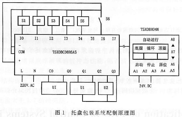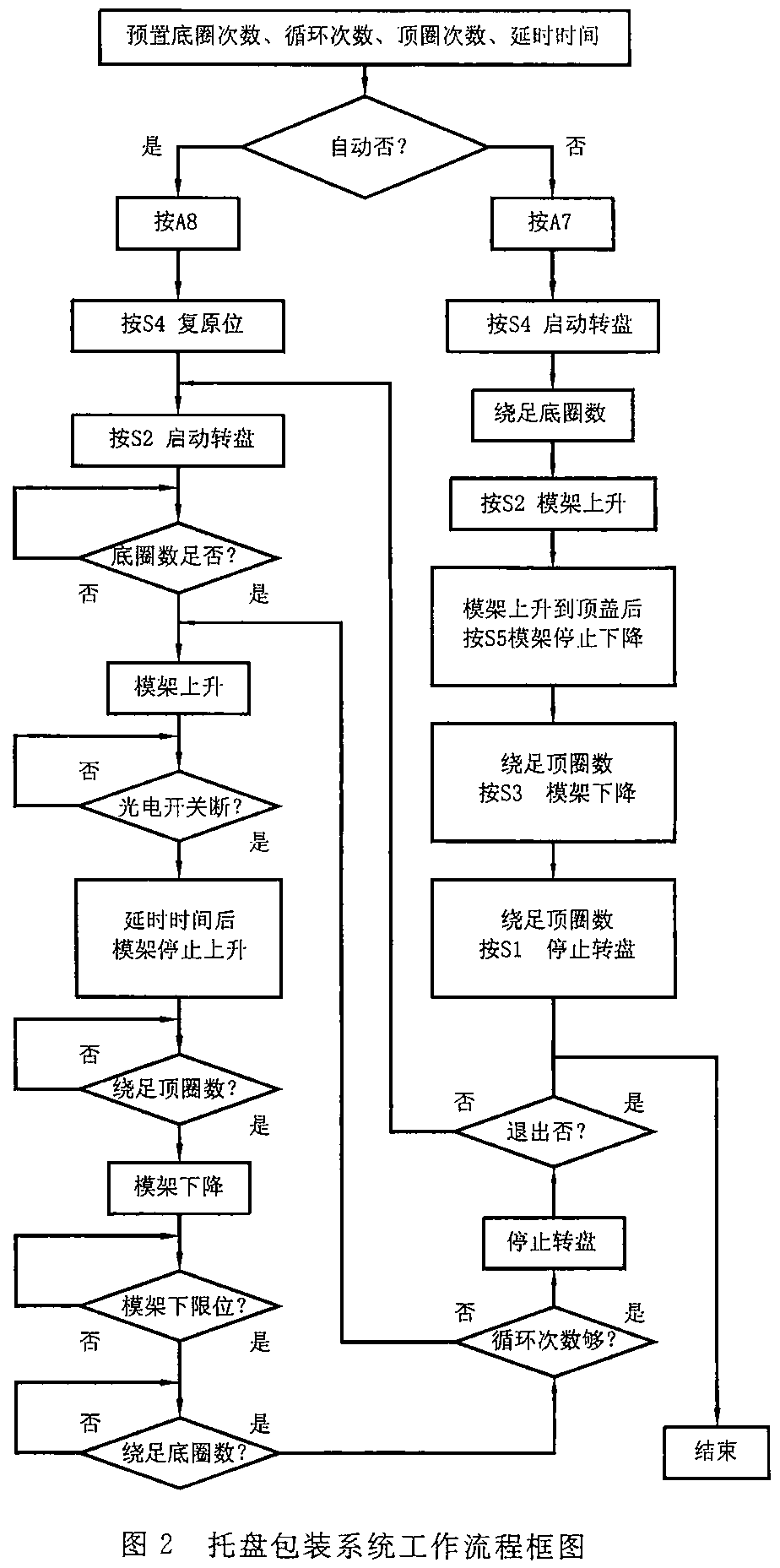 摘要:介紹PLC在玻璃瓶托盤包裝控制系統(tǒng)中的應(yīng)用,較詳細(xì)地?cái)⑹隽讼到y(tǒng)的硬件配制和軟件設(shè)計(jì)。投入運(yùn)行結(jié)果表明效果良好。 關(guān)鍵詞:玻璃瓶罐;托盤包裝;可編程控制;硬件配制;軟件設(shè)計(jì) 隨著對(duì)玻璃酒瓶質(zhì)量(包括外觀清潔度)要求的不斷捉高,傳統(tǒng)的麻袋包裝方式已不能適應(yīng)生產(chǎn)和市場(chǎng)的需要。我廠現(xiàn)用的托盤包裝正好能克服麻袋包裝的弊端,可減少包裝和運(yùn)輸中玻璃瓶(尤其是螺口瓶和異形瓶)的破碎,同時(shí)也避免了因麻袋放久后在瓶子上的積灰甚至被粘附上麻袋腐朽物的難題。 由于成套的在線玻璃瓶托盤包裝機(jī)的機(jī)械結(jié)構(gòu)復(fù)雜,安裝要求嚴(yán)格,設(shè)備投資較大,所以我廠選用了結(jié)構(gòu)簡(jiǎn)單、使用方便、成本低廉的PLC托盤式纏繞機(jī),它以LLDPE拉伸薄膜為包裝材料,對(duì)托盤上的玻璃瓶進(jìn)行拉伸裹包。包裝后的托盤十分適宜玻璃瓶罐的儲(chǔ)運(yùn),極大地減少了瓶子破損率,還提高了瓶子的清潔度。 1 玻璃瓶托盤包裝工藝要求與系統(tǒng)工作過程 先將玻璃瓶從遞送帶上用人工裝滿托盤(可根據(jù)瓶子尺寸分若干層,規(guī)格1300mm×1300mm;高度800~2200mm),并用手動(dòng)液壓搬運(yùn)車?yán)溅?650的鋼板轉(zhuǎn)盤上。再將寬度為500mm、厚度為17~35μm的LLDPE拉伸薄膜穿進(jìn)托盤下端。通過“人機(jī)界面”選擇“手動(dòng)”或“自動(dòng)”工作模式。 系統(tǒng)工作過程:先啟動(dòng)轉(zhuǎn)盤,接近開關(guān)接通,送膜電機(jī)轉(zhuǎn)動(dòng),讓薄膜在托盤下端繞2圈(圈數(shù)可設(shè)置)。由于光線被勻速轉(zhuǎn)動(dòng)托盤上的玻璃瓶阻擋,使得固定在薄膜架上、且對(duì)準(zhǔn)被裹包玻璃瓶的光電開關(guān)“暗通”,所以薄膜架帶著薄膜和光電開關(guān)上升。當(dāng)薄膜從托盤下端裹包到托盤上端玻璃瓶時(shí),升高了的光電開關(guān)可以接收到托盤外的光線,致使光電開關(guān)“亮斷”。但為了讓頂端蓋邊裹包嚴(yán)密,可以設(shè)置在光電開關(guān)“亮斷”后,讓薄膜架繼續(xù)邊包瓶邊上升數(shù)秒鐘(注意:薄膜架只作上下運(yùn)動(dòng),而托盤始終在勻速轉(zhuǎn)動(dòng))才停止,并再在托盤的上方纏繞2圈(圈數(shù)可設(shè)置)。然后薄膜架下降,再讓薄膜從上往下裹包玻璃瓶。最后在托盤下端又纏繞2圈薄膜,托盤停止轉(zhuǎn)動(dòng)。玻璃瓶托盤包裝結(jié)束。 2 系統(tǒng)硬件配制 系統(tǒng)總體結(jié)構(gòu)如圖1所示??删幊炭刂破鱐SX08CD8R6AS為整個(gè)系統(tǒng)的榨制中心,該P(yáng)LC功能齊全,可減少許多中間接觸件,便于實(shí)現(xiàn)簡(jiǎn)化布線,優(yōu)化設(shè)計(jì),提高設(shè)備運(yùn)行的可靠性。又采用TSX08H04M型人機(jī)界面,可方便選擇“手動(dòng)操作”、“自動(dòng)運(yùn)行”、“參數(shù)設(shè)置”等5頁畫面,以分別進(jìn)行系統(tǒng)調(diào)試、參數(shù)設(shè)置、調(diào)整和選擇系統(tǒng)運(yùn)行的方式等。同時(shí)外接變頻器U1、U2、U3,用以分別控制轉(zhuǎn)盤電機(jī)、薄膜架升降電機(jī)和送膜電機(jī)轉(zhuǎn)速。另外,PLC的輸入還分別接人S1“托盤原位”、S2“膜架下限位”、S3“高度限位”、S4“膜架上限位”、S5“進(jìn)膜啟動(dòng)”和S6“緊急停止”等開關(guān)信號(hào),以使系統(tǒng)正常、安全運(yùn)行。 3 系統(tǒng)軟件設(shè)計(jì) 按照“包裝工藝要求與工作過程”要求,該托盤包裝系統(tǒng)有手動(dòng)模式和自動(dòng)模式兩種使用方式。使用手動(dòng)模式時(shí)分別手動(dòng)按“人機(jī)界面”操作面板上的“A1”~“A8”專用按鍵1次或數(shù)次。遇到特殊緊急情況可按動(dòng)S6急停按鈕,使系統(tǒng)緊急停止。使用自動(dòng)模式前必須先預(yù)置好“底圈纏繞次數(shù)”、“頂圈纏繞次數(shù)”、“上下運(yùn)行循環(huán)次數(shù)”和光電開關(guān)在托盤頂端受光后薄膜架停升的“延時(shí)時(shí)間”。然后按動(dòng)A8將畫面翻至自動(dòng)運(yùn)行頁面。工作流程框圖如圖2。 設(shè)計(jì)時(shí)還要注意:允許分別調(diào)整轉(zhuǎn)盤電機(jī)、薄膜架升降電機(jī)和送膜電機(jī)3臺(tái)變頻器的控制頻率設(shè)定值,使3臺(tái)電機(jī)轉(zhuǎn)速配合合適,讓玻璃瓶的包裝效果最佳;為了安全運(yùn)行,還應(yīng)分別考慮薄膜架的升降極限位置;因某些異形玻璃瓶層間進(jìn)光較強(qiáng),需適當(dāng)修正光電開關(guān)方向或調(diào)節(jié)光電開關(guān)感測(cè)距離。另外,不允許在自動(dòng)停止過程中按動(dòng)S6按鍵使其急停 ![]() ![]() |
