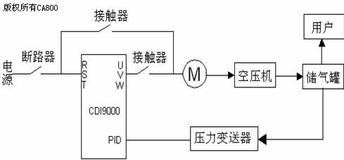 由變頻器,壓力變送器、電機(jī)等組成壓力閉環(huán)控制系統(tǒng)自動(dòng)調(diào)節(jié)電機(jī)轉(zhuǎn)速,使儲(chǔ)氣罐內(nèi)空氣壓力穩(wěn)定在設(shè)定范圍內(nèi),進(jìn)行恒壓控制。反饋壓力與設(shè)定壓力進(jìn)行比較運(yùn)算,實(shí)時(shí)控制變頻器的輸出同步,從而調(diào)節(jié)電機(jī)轉(zhuǎn)速,使儲(chǔ)氣罐內(nèi)空氣壓力穩(wěn)定在設(shè)定壓力上。由于空壓機(jī)屬于重負(fù)荷,132KW空壓機(jī)需采用G160KW變頻器控制。 ![]() 空壓機(jī)變頻改造原理圖 五、空壓機(jī)變頻改造后優(yōu)點(diǎn) a、變頻運(yùn)行狀態(tài)保持儲(chǔ)氣罐出口壓力穩(wěn)定,壓力波動(dòng)范圍±0.02Mpa。