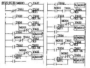 (1)主控部分 這部分實現(xiàn)對四臺樣品通電時間的順序控制以及在必要時輸出熔焊信號。主控部分梯形圖如圖5所示,圖中T550和T650~T657實現(xiàn)如圖4所示的有關(guān)時間段,M300~M302用來實現(xiàn)計時信號的保持和清除,Y431~Y434分別用來控制四臺樣品的通斷,M305和Y437實現(xiàn)熔焊信號的輸出。
