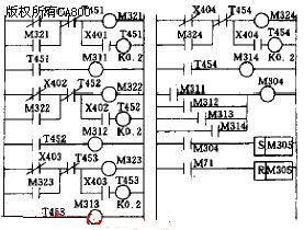 (2)熔焊保護部分 這部分通過對四臺樣品輔助常閉觸點X401~X404的在線監(jiān)測,將產(chǎn)生的熔焊信號分別輸出到M311~M314,將這四個信號相或后輸出到M304,為了在樣品發(fā)生熔焊并將其剔除出試驗后,重新投入運行,將該信號轉(zhuǎn)換后輸出到M305,將其作為最終的熔焊信號。這部分的梯形圖如圖6所示,圖中的T451~T454對觸頭閉合時間計時,定時時間設(shè)為200ms,留有充分的裕度。M321~M324起中間繼電器的作用。