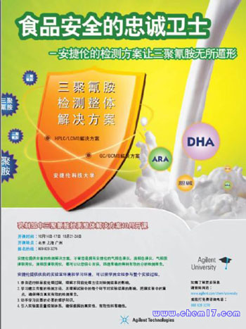 作為業(yè)界領(lǐng)先的分析測(cè)試公司,為了幫助用戶解決目前對(duì)乳品中三聚氰胺檢測(cè)的迫切需求,安捷倫科技公司率先提供了從檢測(cè)儀器到樣品前處理和數(shù)據(jù)分析的整體解決方案。應(yīng)用技術(shù)支持部在北京用戶卓越中心實(shí)驗(yàn)室,第一時(shí)間完成了Agilent1200/1120液相色譜儀、Agilent7890/5975氣質(zhì)聯(lián)用儀和Agilent RRLC/6410B液質(zhì)聯(lián)用儀三種儀器測(cè)試奶粉、液態(tài)奶等乳品中三聚氰胺的檢測(cè)方法,,今天安捷倫大學(xué)更首家推出三聚氰胺解決方案培訓(xùn)課程。