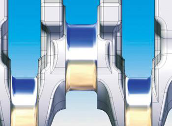 ?。?)窄砂輪磨削(砂輪寬度低于止推軸頸檔寬尺寸)。在使用窄砂輪磨削中,成形磨削采用的防燒傷措施均可應用于此種方法的磨削,只不過窄砂輪磨削在砂輪進給方式上可有更多的選擇。一種是徑向切入法磨削,此種磨削如調(diào)整不當可造成前文所述的喇叭口形狀;另一種是斜切方式磨削,第一步,使砂輪從軸頸的右側(cè)以斜切方式進入,磨削至要求尺寸,再快速沿原角度方向斜退出;第二步,使砂輪從軸頸的左側(cè)以斜切方式進入,磨削至要求尺寸,再快速沿原角度方向斜退出;第三步,使砂輪從軸頸的中間快速切入磨削至要求尺寸,再快速推出。其工序磨削余量和冷卻方式與成形磨削采用一致的參數(shù)。
