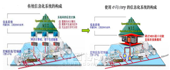 傳統(tǒng)信息化系統(tǒng)和使用MES模塊的信息化系統(tǒng)的構(gòu)成如下圖所示
