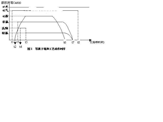 對(duì)等離子熔積過(guò)程進(jìn)行分析,從送氣開(kāi)始到產(chǎn)品成形,各工藝動(dòng)作要按照一定的先后順序和時(shí)間間隔銜接起來(lái)。工藝動(dòng)作程序選定是否合理,對(duì)工藝過(guò)程穩(wěn)定性和焊層質(zhì)量有很大的影響。典型的等離子熔積過(guò)程可分為起弧,熔積和熄弧三個(gè)階段,按照工藝的要求,各工藝動(dòng)作的銜接上,有時(shí)需要延時(shí),有時(shí)則需要同時(shí)動(dòng)作或同時(shí)停止。一般選擇的工藝動(dòng)作時(shí)序如圖1所示。