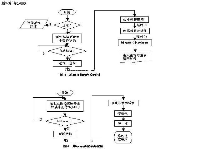 首先需要數(shù)控機(jī)床和熔積設(shè)備均處于準(zhǔn)備就緒狀態(tài),即能分別完成獨(dú)立的功能(數(shù)控機(jī)床完成堆焊的運(yùn)動(dòng)過(guò)程,熔積設(shè)備完成熔積過(guò)程)。然后先由數(shù)控機(jī)床發(fā)出準(zhǔn)備就緒可以開(kāi)始起弧命令,熔積設(shè)備接到起弧信號(hào),要依次送氣(打開(kāi)工作氣閥)—送粉―引非?。鸶哳l-引轉(zhuǎn)弧,到此引弧階段結(jié)束,由熔積設(shè)備向數(shù)控機(jī)床發(fā)出可以開(kāi)始運(yùn)動(dòng)命令,最后進(jìn)入堆焊階段。根據(jù)快速成型路徑規(guī)劃的特點(diǎn),在一層熔積過(guò)程中可能需要多次起弧,即其路徑可能是不連續(xù)的。這樣,就需要在一層熔積過(guò)程中熄掉轉(zhuǎn)弧,為引弧方便和快速,我們可以考慮保留非弧。因此熔積過(guò)程中需要查詢是需要熄掉轉(zhuǎn)弧,保留非弧,還是非弧、轉(zhuǎn)弧都熄掉。為了保證熔積質(zhì)量,考慮熔積一層或幾層,用銑刀銑削一次。當(dāng)需要銑削時(shí),就需要非弧、轉(zhuǎn)弧都熄掉。當(dāng)需要熄弧時(shí),也是由數(shù)控機(jī)床根據(jù)G代碼指令,向熔積設(shè)備發(fā)送開(kāi)始熄弧指令,工控機(jī)接到指令后,熔積設(shè)備依次送粉衰減―轉(zhuǎn)弧衰減―非弧衰減―停氣,之后進(jìn)入等待狀態(tài),等待下一次熔積開(kāi)始指令。其中熔積開(kāi)始程序流程和結(jié)束流程分別如下: