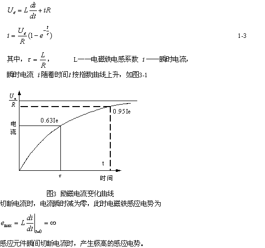 2.2 磁滯性 當(dāng)鐵心線圈通有交變電流時,鐵心就受到交變磁化。在電流變化一次時,磁感應(yīng)強(qiáng)度B隨著磁場強(qiáng)度H而變化的關(guān)系如圖2-2,由圖可見,當(dāng)H減到零值時,B還沒有回到零值。這種磁感應(yīng)強(qiáng)度滯后于磁場強(qiáng)度變化的性質(zhì)稱為磁性物質(zhì)的磁滯性。 當(dāng)線圈中電流減到零值時(H=0),鐵心在磁化時所得的磁性還沒有完全消失,這時鐵心中所保留的磁感應(yīng)強(qiáng)度Br為剩磁,如圖2-2中的O-2和O-5段。要使鐵心的剩磁消失,一般要改變線圈中勵磁電流的方向,也就是改變磁場強(qiáng)度H的方向進(jìn)行反向磁化。使B=0的H值,在圖中用O-3和O-6代表,稱為矯頑磁力Hc。 3. 電磁鐵電氣特性 3.1 電磁鐵線圈電流動態(tài)特性 電磁特性中,磁滯回線是靜態(tài)電流與電磁力的函數(shù)曲線,在起吊和卸載過程中,電流經(jīng)常在動態(tài)中完成控制,在線圈工作溫度和環(huán)境因素不變的情況下,電磁鐵的電阻和電感可以看作常數(shù)。當(dāng)電磁鐵接通電源時,電流的動態(tài)方程為:
