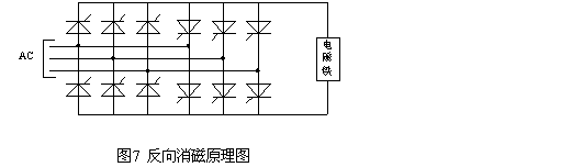 3.維持吊重優(yōu)化控制原理 長時間的強(qiáng)勵電流會使電磁鐵繞組過熱,可能燒壞繞組。另外也增加了電能的損耗。根據(jù)負(fù)載的大小和電磁鐵吸力公式,可以計算出維持吊重理論電流的大小,在此基礎(chǔ)上乘以一個保險系數(shù),得到實際電流大小。 4.退磁優(yōu)化控制原理 一般的退磁方法是在電磁鐵電流為零時輸入反向電流。電磁鐵在斷電瞬間,內(nèi)部繞組相當(dāng)于一個大電感,傳統(tǒng)的直流接觸器開關(guān)動作慢,因而產(chǎn)生相當(dāng)大的自感電勢,其值可達(dá)上千伏,因無退磁回路,所以在觸點(diǎn)處便形成電弧放電,燒壞設(shè)備。 Mentor || 直流驅(qū)動器是一個可控硅全控橋電流控制器。通過控制可控硅的觸發(fā)角,不僅可以控制電流的大小,也可以控制電流的方向。在電磁鐵斷電瞬間,通過控制可控硅的觸發(fā)角,在電磁鐵兩端加反向電流。這個過程非常短,能夠到達(dá)毫秒級。因而能夠?qū)㈦姶盆F儲存的能量一部分克服矯頑磁力,一部分反饋到電網(wǎng)而不產(chǎn)生破壞作用。在剩磁消失后,反向電流也減為零。一般的反向電流的大小可以通過磁滯回線計算得出。在電磁鐵吸力小于吊重時,就可以斷電。其原理如下: