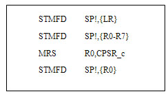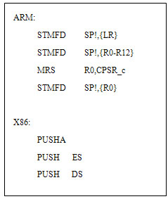圖1. 中斷響應(yīng)示意圖 三、中斷現(xiàn)場保護的改進 3.1 傳統(tǒng)中斷現(xiàn)場保護方法 對于現(xiàn)在大多數(shù)嵌入式操作系統(tǒng),在進入中斷時首先做的第一件事就是保護中斷發(fā)生前的現(xiàn)場,即保存返回地址、程序狀態(tài)字、堆棧指針以及所有通用寄存器到中斷堆棧,以防止用戶中斷服務(wù)子程序?qū)χ袛喾祷睾蟋F(xiàn)場的破壞。以μC/OS-II微內(nèi)核為例,在ARM和X86兩種體系結(jié)構(gòu)微處理器上進入中斷后保存現(xiàn)場的過程如圖2所示。從代碼中可見,兩種不同的體系結(jié)構(gòu)中,為保護現(xiàn)場,都需要執(zhí)行三條訪存指令,其中一條為批量訪存指令(STMFD SP!,{R0-R12}和PUSHA)用以保護通用寄存器R0-R12和AX,CX,DX,BX,SP,BP,SI,DI。