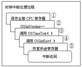 ![]() 圖2. ARM、X86上μC/OS-II中斷現(xiàn)場保護 根據(jù)量化公式: 公式中以CPU時間來衡量微處理器體系結(jié)構(gòu)的性能。其中前半部分是指令的執(zhí)行時間,包括取指、分析、執(zhí)行等,而后半部分表明如果指令是訪存指令則在cache不命中時CPU時間還應(yīng)該加上訪存的時間。由于訪存速度遠(yuǎn)遠(yuǎn)大于CPU的執(zhí)行速度,尤其是批量訪存指令,一旦遇到存儲器分體沖突,將等待更長的時間。而在ARM7TDMI、ARM9TDMI這些沒有cache的微處理器內(nèi)核中,批量訪存指令的CPU時間公式就完全變成如下形式: 因此,在這些處理器內(nèi)核中在處理諸如任務(wù)切換和進入中斷的現(xiàn)場保護的批量訪存指令時,系統(tǒng)將等待,從而影響實時性。 3.2 中斷現(xiàn)場保護的優(yōu)化策略 中斷現(xiàn)場保護中,保護返回地址、程序狀態(tài)字、堆棧指針是必需的,否則中斷結(jié)束后將無法順利返回。而保護通用寄存器的目的在于防止用戶中斷服務(wù)子程序使用其中的寄存器,造成對原有內(nèi)容的覆蓋而在中斷返回后任務(wù)執(zhí)行出錯。因此在中斷里對通用寄存器的保護完全可以取決于中斷服務(wù)子程序?qū)νㄓ眉拇嫫鞯氖褂们闆r,僅僅保存中斷服務(wù)子程序中所用到的有限的幾個通用寄存器,而不必保存所有通用寄存器。以ARM體系結(jié)構(gòu)為例,在用戶模式下可用的通用寄存器為R0~R12,R13用作堆棧指針、R14為返回地址、R15用作PC,如果在中斷服務(wù)子程序中只用到R0~R12中的一小部分,則在中斷到來時可以僅僅只保存通用存器中的這一小部分,從而能夠減少訪存時間,最終達(dá)到縮短中斷響應(yīng)提高中斷實時性的目的。 在實際情況中,這種策略是具有可行性的。首先,每個中斷服務(wù)子程序中所需要的通用寄存器是可知的。在使用匯編語言編寫用戶中斷服務(wù)子程序時,所需要的通用寄存器由程序員控制,使用C語言則由編譯器決定具體使用到哪幾個通用寄存器。其次,在現(xiàn)有的嵌入式操作系統(tǒng)中,往往要求中斷服務(wù)子程序盡可能的短小,例如在Linux中,把中斷服務(wù)子程序分成Bottom Half和Top Half。因此,在大多數(shù)中斷服務(wù)子程序中并沒有用到所保護的全部通用寄存器,造成對其余通用寄存器的多余保護。 3.3 μC/OS-II時鐘中斷現(xiàn)場保護優(yōu)化 時鐘中斷是操作系統(tǒng)中比較重要的一個部分,也是實時性要求較高的部分,在UNIX中時鐘中斷的優(yōu)先級定義為6,僅次于最高優(yōu)先級。以μC/OS-II時鐘中斷處理為例,中斷處理過程如圖3。μC/OS-II時鐘中斷服務(wù)中,首先要對中斷嵌套計數(shù)器OSIntNesting進行加1操作,防止在嵌套的中斷中進行任務(wù)調(diào)度;隨后調(diào)用OSTimeTick()對每個睡眠任務(wù)的OSTCBDly進行減1以及對系統(tǒng)時間OSTime加1操作;最后調(diào)用OSIntExit()進行任務(wù)調(diào)度,如果不需要任務(wù)切換則返回到中斷服務(wù)程序中??梢娫跁r鐘中斷處理中,操作最多的集中在OSTimeTick()和OSIntExit()這兩個函數(shù)上。通過ARMCC編譯器的-s選項對兩者進行編譯,在得到的匯編代碼中,前者需要使用R0、R1、R4-R7,后者需要R0-R3,沒有使用R8-R12,而OSIntNesting++的操作也完全可以使用R0-R7進行,這樣,在進入中斷處理時,需要保存的通用寄存器僅僅為R0-R7。因此對圖3中的①進行改寫得到的保護中斷現(xiàn)場的代碼如圖4所示。