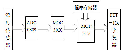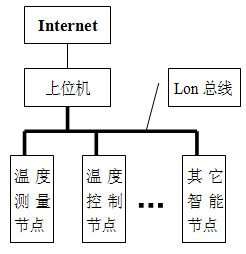 圖1 系統(tǒng)結(jié)構(gòu)圖 ![]() 圖2 溫度控制節(jié)點(diǎn)結(jié)構(gòu)圖 3.系統(tǒng)結(jié)構(gòu)設(shè)計(jì) 系統(tǒng)結(jié)構(gòu)如圖1所示,共包含三大部分:上位機(jī)、LON總線和智能節(jié)點(diǎn)。其中: 上位機(jī)主要負(fù)責(zé)LON網(wǎng)絡(luò)的安裝、維護(hù)和管理,可對(duì)溫度進(jìn)行實(shí)時(shí)監(jiān)控。同時(shí)建立測(cè)量值數(shù)據(jù)庫(kù),對(duì)數(shù)據(jù)進(jìn)行存檔和歸表以便查詢、打印。上位機(jī)還可作為Web服務(wù)器與Internet相連,實(shí)現(xiàn)遠(yuǎn)程監(jiān)控。 智能節(jié)點(diǎn)主要包括溫度控制節(jié)點(diǎn)和溫度測(cè)量節(jié)點(diǎn)。溫度測(cè)量節(jié)點(diǎn)對(duì)溫度進(jìn)行測(cè)量并對(duì)非線性值進(jìn)行線性化處理,使得到的數(shù)值有足夠的精度和線性度,并定期將溫度對(duì)應(yīng)的數(shù)字量發(fā)送到LON總線上交上位機(jī)處理。溫度控制節(jié)點(diǎn)采用模糊控制算法對(duì)冷水閥進(jìn)行控制,并負(fù)責(zé)各采樣點(diǎn)溫度采樣值的顯示與上傳。 4.智能節(jié)點(diǎn)硬件設(shè)計(jì) 智能節(jié)點(diǎn)采用的Neuron芯片是可帶外存儲(chǔ)器的MC143150。其片內(nèi)有三個(gè)CPU,即:網(wǎng)絡(luò)CPU,應(yīng)用CPU和介質(zhì)訪問CPU。它們與I/0口驅(qū)動(dòng)電路、定時(shí)器、片內(nèi)存儲(chǔ)器、網(wǎng)絡(luò)通訊接口通過8位數(shù)據(jù)總線和16位地址相連。該芯片有11個(gè)可編程的I/0口對(duì)象。通過引腳的不同配置,為外部硬件提供靈活的接口,實(shí)現(xiàn)不同的I/0對(duì)象。 4.1溫度控制節(jié)點(diǎn)的設(shè)計(jì) 溫度控制節(jié)點(diǎn)主要包括:Neuron芯片MC143150,外帶的程序存儲(chǔ)器,D/A轉(zhuǎn)換,執(zhí)行機(jī)構(gòu),顯示電路和總線收發(fā)器等,如圖2所示。D/A轉(zhuǎn)換選用MAX7228,顯示電路由MAX7219及相關(guān)的驅(qū)動(dòng)電路構(gòu)成,執(zhí)行機(jī)構(gòu)包括AD694及其相關(guān)的外圍電路。執(zhí)行機(jī)構(gòu)是角行程電動(dòng)執(zhí)行機(jī)構(gòu),應(yīng)用于冷水閥控制。模糊推理所用的知識(shí)庫(kù)數(shù)據(jù)存放于神經(jīng)元芯片的E2PROM存儲(chǔ)器中,有一組初始值。系統(tǒng)運(yùn)行期間可以通過LON總線從上位機(jī)獲取新的控制參數(shù),從而完成控制參數(shù)的更新。 4.2溫度測(cè)量節(jié)點(diǎn)的設(shè)計(jì) 溫度測(cè)量節(jié)點(diǎn)的結(jié)構(gòu)如圖3所示。包括神經(jīng)元芯片MC143150,程序存儲(chǔ)器,溫度傳感器,光電耦合器MOC3020,A/D轉(zhuǎn)換電路ADC0809, FTT-10A收發(fā)器等。