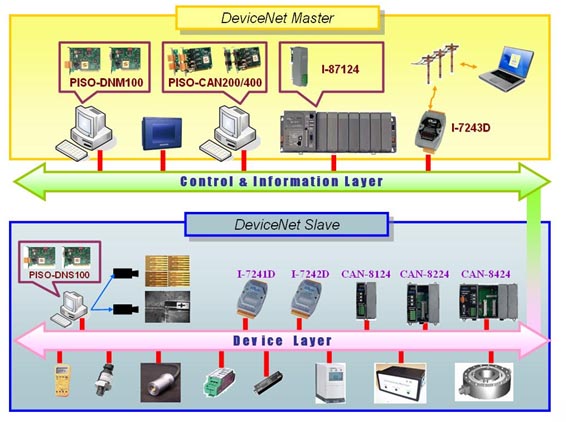 泓格公司的PISO-DNS100產(chǎn)品不僅能讓您在最短的時間內(nèi)設(shè)計出DeviceNet Slave工作站,彈性地規(guī)劃您的I/O數(shù)據(jù)更能減少您開發(fā)DeviceNet Slave工作站的時間,建立更穩(wěn)定的系統(tǒng),以下將用圖型描繪出一個典型的網(wǎng)絡(luò)架構(gòu)。