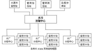 城市自來水SCADA系統(tǒng)可劃分為5個(gè)組成部分:水司控制中心、水廠分控中心、管網(wǎng)測(cè)壓站、管網(wǎng)加壓站和水源井監(jiān)控站。其結(jié)構(gòu)框圖如圖所示。
