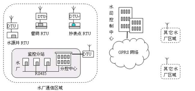 城市自來水公司生產(chǎn)過程自動(dòng)化監(jiān)控系統(tǒng)(SCADA)包括:水司控制中心、多個(gè)水廠分控中心、多個(gè)水廠監(jiān)控分站、多個(gè)水源井監(jiān)控站、多個(gè)管網(wǎng)加壓站和多個(gè)管網(wǎng)測(cè)壓站。除一個(gè)水廠內(nèi)各監(jiān)控分站較為集中外,其它監(jiān)控站點(diǎn)均散布在城市的各個(gè)區(qū)域。由于GPRS網(wǎng)絡(luò)覆蓋面廣,通訊速率高,穩(wěn)定性好,H7000 GPRS無線數(shù)據(jù)傳輸系統(tǒng)有著顯著的優(yōu)勢(shì):
