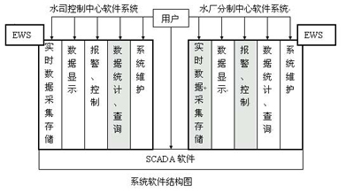 自來水SCADA系統(tǒng)軟件分為兩大部分:水司控制中心軟件系統(tǒng)軟件和水廠分控中心系統(tǒng)軟件。它們結(jié)構(gòu)類似,只是側(cè)重點(diǎn)不同。前者側(cè)重于統(tǒng)計(jì)、查詢,后者側(cè)重于報(bào)警和控制。它們的結(jié)構(gòu)如圖所示。