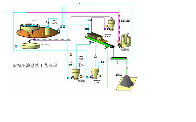 .濃縮壓濾系統(tǒng)借助泵或壓縮空氣,將固、液兩構(gòu)成的礦漿在壓力差的作用下,通過過濾介質(zhì)(濾布)而實(shí)現(xiàn)固液分離的一種方法。壓濾循環(huán):•給料階段•加壓過濾階段•卸料階段•濾布清洗階段