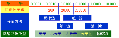 由于切割分子量的區(qū)別,膜被分成反滲透(RO)、納濾(NF)、超濾(UF)、微濾(MF)。其大約如下圖所示: