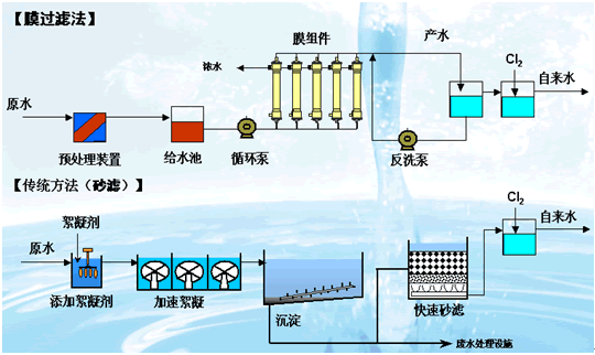 圖一、膜過(guò)濾法與傳統(tǒng)砂濾方法比較