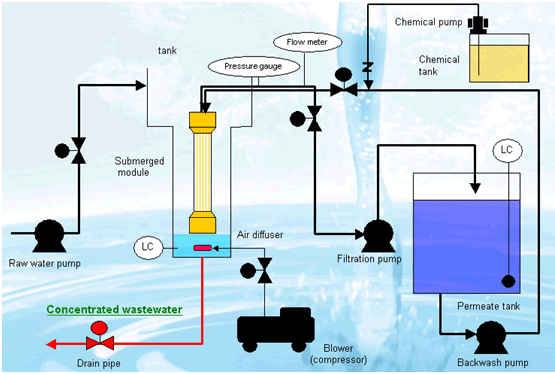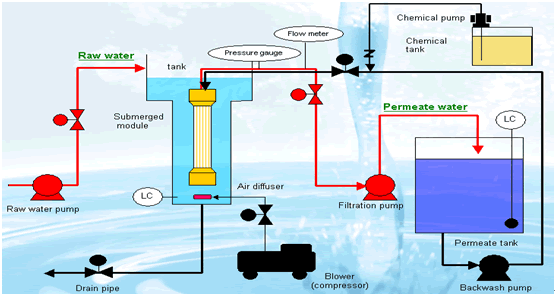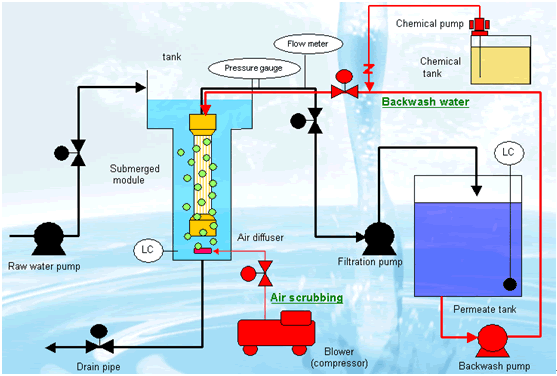 膜處理系統(tǒng)流程分為過(guò)濾、反洗及空氣擦洗及沖洗三個(gè)過(guò)程。