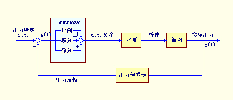 恒壓供水系統(tǒng)的變頻器接線圖 一般按照工藝對控制性能的要求,來選擇比例常數(shù)Kp和積分常數(shù)Ki。比例控制KP加大,使系統(tǒng)的動作靈敏,速度加快,KP偏大,振蕩次數(shù)加多,調(diào)節(jié)時間加長。當(dāng)KP太大時,系統(tǒng)會趨于不穩(wěn)定。若KP太小,又會使系統(tǒng)的動作緩慢;積分環(huán)節(jié)Ki通常使系統(tǒng)的穩(wěn)定性下降。Ki太小系統(tǒng)將不穩(wěn)定。Ti偏小,振蕩次數(shù)較多。Ki偏大,對系統(tǒng)性能的影響減小。當(dāng)Ki合適時,過渡過程比較合理。微分控制Kd可以改善動態(tài)特性,當(dāng)Kd偏大時,超調(diào)量δd較大,調(diào)節(jié)時間較長,當(dāng)Kd偏小時,超調(diào)量δp也較大,調(diào)節(jié)時間也較長,只有Kd合適時,可以得到比較滿意的過渡過程。 PID調(diào)節(jié)過程首先引入比例控制KP,在系統(tǒng)穩(wěn)定的情況下,減小穩(wěn)態(tài)誤差,提高精度,但是加大KP只能減小穩(wěn)態(tài)誤差,卻不能完全消除穩(wěn)態(tài)誤差。然后引入積分控制Ki,消除系統(tǒng)的穩(wěn)態(tài)誤差,提高控制系統(tǒng)的控制精度。最后引入微分控制Kd,減小超調(diào)量,改善系統(tǒng)品質(zhì)。變頻器根據(jù)偏差調(diào)節(jié)PID的參數(shù),當(dāng)運行參數(shù)遠(yuǎn)離目標(biāo)參數(shù)時,調(diào)節(jié)幅度加快,隨著偏差的逐步接近,跟蹤的幅度逐漸減小,近似相等時,系統(tǒng)達(dá)到一個動態(tài)平衡,維持系統(tǒng)的恒壓穩(wěn)定狀態(tài)。