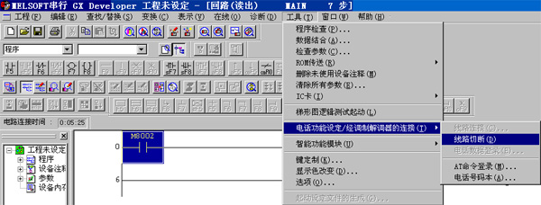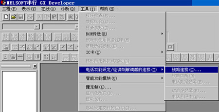 當(dāng)使用GX Developer軟件(Version 7.08J)時(shí): 1. 選擇“工具”/“電話功能設(shè)定/經(jīng)調(diào)制解調(diào)器的連接”/“線路連接…”。