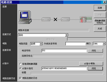 3. 在出現(xiàn)的“電路連接”對(duì)話框中指定“電路類型”,“端口”,“電話號(hào)碼”和“AT指令”。