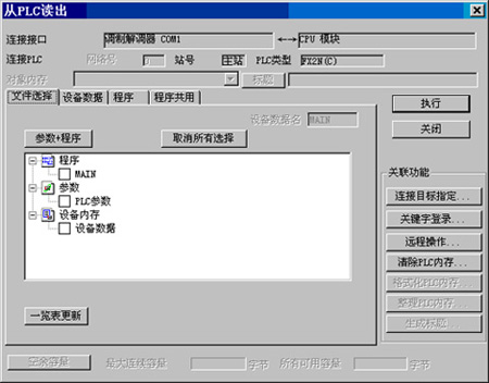 6.此時(shí)會(huì)出現(xiàn)“從PLC讀出”對(duì)話框。在需要讀出的項(xiàng)目前打勾,點(diǎn)擊“執(zhí)行”后將從 PLC中讀出對(duì)應(yīng)的內(nèi)容。