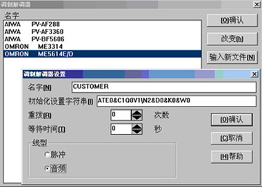 2. 在出現(xiàn)的“調(diào)制解調(diào)器”對(duì)話框中點(diǎn)擊“輸入新文件”,在隨后出現(xiàn)的“調(diào)制解調(diào)器設(shè)置”對(duì)話框中設(shè)置好“名字”,“初始化設(shè)置字符串”及“線型”并確認(rèn)。