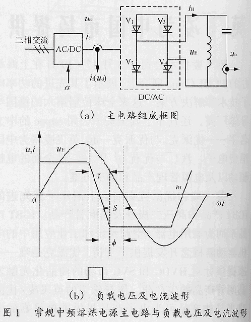 常規(guī)中頻電源是由AC/DC可控整流器與單相DC/AC電流型并聯(lián)諧振逆變器組成的,它在感應(yīng)加熱熔煉過程中的正常工作如圖1所示,是以負(fù)載電路中的電流iH超前其電壓uH為前提條件的。逆變電路中晶閘管的超前觸發(fā)時(shí)間應(yīng)大于晶閘管關(guān)斷時(shí)間,即
