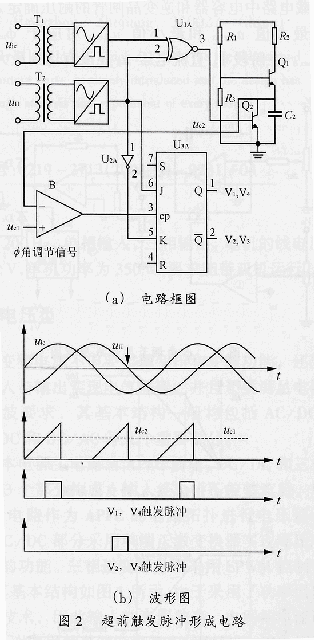 圖2是TOT控制法“超前觸發(fā)脈沖形成電路”框圖及波形圖。該電路由中頻負(fù)載電路電壓uH和電容支路電流信號(hào)及其轉(zhuǎn)換電路,異或非門U1A,比較器B,JK觸發(fā)器U3A和斜波生成電路組成。其核心部分是保證在uH過零之前的TOT時(shí)間內(nèi),比較器B產(chǎn)生下降沿,使JK觸發(fā)器翻轉(zhuǎn),由Q及Q端輸出超前觸發(fā)脈沖。比較器B反相輸入端接斜坡電壓信號(hào)uc2;而同相輸入端接角調(diào)節(jié)信號(hào)uc1。通過uc1與uc2比較(交點(diǎn))確定觸發(fā)脈沖位置。