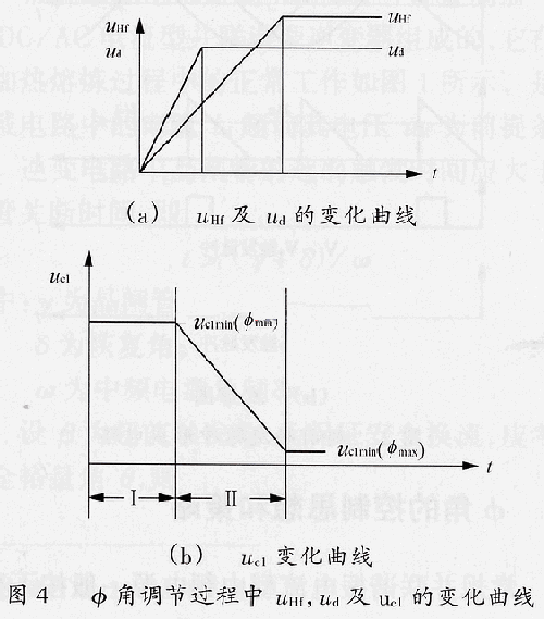 調(diào)節(jié)φ角的控制電路如圖3所示。圖中①是用于控制場(chǎng)效應(yīng)管Q1“通-斷”的比較器;②是φ角調(diào)節(jié)器;③是加法器;④是限幅電路;⑤是超前觸發(fā)脈沖形成電路。圖4給出了φ角調(diào)節(jié)過程中uHf(中頻爐線圈電壓反饋值),ud及uc1的變化曲線。系統(tǒng)在投入工作前uH*為最大值(可根據(jù)中頻負(fù)載電路中電容器和逆變晶閘管的耐壓確定),uc1的最大值uc1max和最小值uc1min對(duì)應(yīng)于φmin和φmax。在階段Ⅰ,直流電壓ud還沒有達(dá)到最大值,uH的大小完全由原有整流橋控制角α調(diào)節(jié),此時(shí)ud小于比較器①整定值ub1,比較器①輸出高電平,場(chǎng)效應(yīng)管Q1導(dǎo)通,φ角調(diào)節(jié)器②不起作用,③輸出為最大值,④輸出為uc1的最大限幅值uc1max(φmin);在階段Ⅱ,直流電壓ud已達(dá)到最大值,比較器①翻轉(zhuǎn),使場(chǎng)效應(yīng)管Q1截止,φ角調(diào)節(jié)器開始工作,并自動(dòng)進(jìn)行調(diào)節(jié)。若調(diào)節(jié)過程中φ角大于φmax。則由④輸出進(jìn)行限幅。