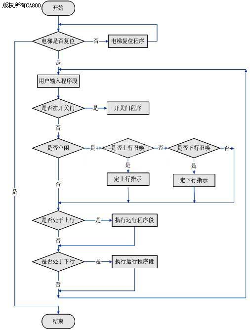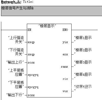 表1 I/O點數(shù)分配 ![]() 3.2 程序流程圖 PLC編程的思路如圖2所示: ![]() 圖2 程序流程圖 圖2中各部分說明如下: (1)電梯復(fù)位 (2)用戶輸入程序段 (3)轎廂開關(guān)門程序段 (4)設(shè)定上行、下行指示 (5)執(zhí)行上行程序 (6)執(zhí)行下行程序 3.3 程序設(shè)計 由于呼叫是隨機的, 電梯控制系統(tǒng)采用模塊化編程方法。 使用STEP7編程軟件將程序分為七個邏輯塊:開關(guān)門FC1、樓層信號FC2、內(nèi)選信號FC3、外呼信號FC4、定上下行指示FC5、停層FC6、啟停、運行FC7。 ⑴在主程序OB1中調(diào)用7個邏輯塊(以FC2為例)實現(xiàn)電梯的邏輯控制功能。如圖3所示,將“上行強迫開關(guān)”、“樓層1顯示”等實參賦給FC2(樓層顯示),即可實現(xiàn)FC2的調(diào)用。