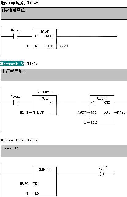 ![]() 圖3 OB1調(diào)用FC2 ⑵當(dāng)電梯位于某一層時,應(yīng)產(chǎn)生位于該層的樓層信號,以控制樓層顯示器顯示樓層處的位置,離開該層時,該信號應(yīng)被新的樓層信號(上一層或下一層)取代。電梯的樓層數(shù)存放在MW20中?!?sxqpkg”是上強迫行程開關(guān)的形參,當(dāng)電梯到達5樓時,使MW20為5?!?xxqpkg”是下強迫行程開關(guān),當(dāng)電梯到達1樓時,使MW20為1。在中間,電梯上行時,每上一層,MW20加1;電梯下行時,每下一層,MW20減1。如果層顯有誤,只要將電梯開到頂層或1層,馬上就能顯示正常[2> [3>。梯形圖如圖4所示。 ![]() 圖4 樓層顯示 由于功能FC中使用了形參和隨機變量,只要主程序中賦予FC適當(dāng)?shù)膶崊?,該FC即可被不同系統(tǒng)的主程序調(diào)用。 4 變頻器部分設(shè)計 電梯的一次完整的運行過程,就是曳引電動機從起動、勻速運行到減速停車的過程。為使乘客擁有良好的舒適感,電梯采用S型速度曲線,轉(zhuǎn)換成頻率曲線如圖5所示。 ![]() 圖5 變頻器頻率曲線 通過設(shè)置變頻器的參數(shù)如表2所示,實現(xiàn)了電梯速度的平滑性,達到了順利啟動和準(zhǔn)確停車的要求[4>。