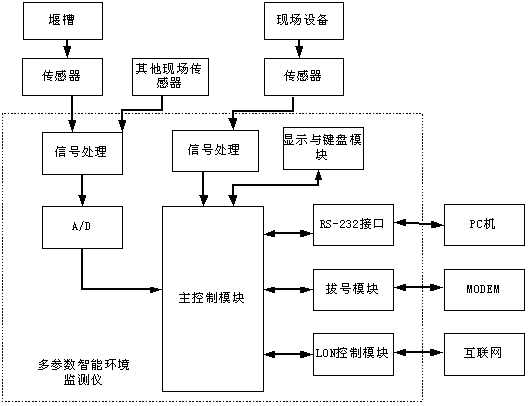“VHB-2000多參數(shù)智能環(huán)境監(jiān)測儀”定位為集監(jiān)測儀器中的流量計(jì)、污染處理設(shè)施運(yùn)行記錄儀、污染參數(shù)采集儀、適配器于一體的通用監(jiān)測終端系統(tǒng)。系統(tǒng)主要包括:主控模塊、顯示鍵盤模塊、撥號(hào)控制模塊、LonWorks控制模塊。
