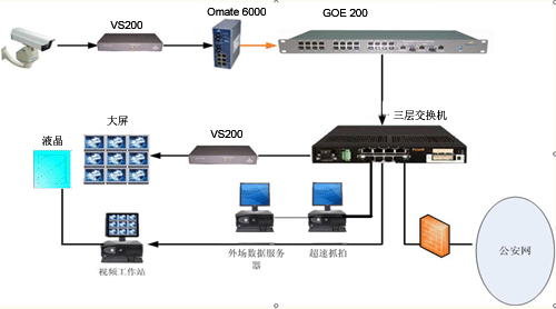 接入層是系統(tǒng)的最底層,負(fù)責(zé)圖像,信息屏,測(cè)速點(diǎn)的信息采集。其中信息屏,測(cè)速點(diǎn)已經(jīng)是數(shù)字接口,可以方便的接入網(wǎng)絡(luò)。攝像機(jī)的視頻信號(hào)是模擬數(shù)據(jù),必須經(jīng)過視頻編碼器進(jìn)行數(shù)字化轉(zhuǎn)換,才能接入網(wǎng)絡(luò)。壓縮算法采用MPEG2方式,可以達(dá)到廣播級(jí)(DVD)還原效果。編解碼總延時(shí)小于300ms。
