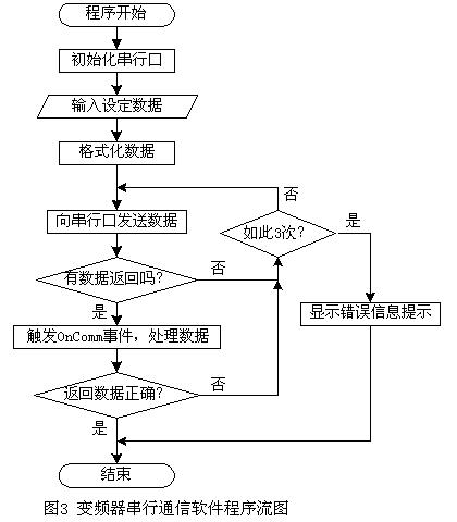 變頻器的串行口通信協(xié)議分析 通過對油田輸油控制系統(tǒng)的結(jié)構(gòu)設(shè)計,以及對三菱FR-A500變頻器原理及通信方式的研究,我們發(fā)現(xiàn)三菱FR-A500變頻器的通信方式為異步半雙工RS—485協(xié)議;波特率19200bit/s,9600bit/s,4800bit/s 可選;ASCII 7或8位數(shù)據(jù)位可選;1位奇偶校驗可選;1或2位停止位可選。其通信協(xié)議的數(shù)據(jù)格式有十種,分別為: A,A’,B,C,D,E,E’,F(xiàn),G,H; 下面以格式A為例簡要說明一下變頻器通信協(xié)議: 格式A的功能是變頻器運行頻率、運行參數(shù)的寫入和復(fù)位變頻器,其結(jié)構(gòu)如下: *1 ENQ——表示控制代碼,它有以下幾種:(括號內(nèi)為ASCII碼) STX (H02) 正文數(shù)據(jù)開始;ETX (H03) 正文數(shù)據(jù)結(jié)束;ENQ (H05) 通信請求; ACK (H06) 應(yīng)答無數(shù)據(jù)錯誤;LF (H0A) 換行;CR (H0D) 回車; NAK (H15) 應(yīng)答發(fā)現(xiàn)數(shù)據(jù)錯誤; *2變頻器站號——可用十六進制數(shù)在H00和H1F(站號0 至31 )間設(shè)定; *3指令代碼——由計算機發(fā)給變頻器,指明程序要求(如:監(jiān)視、運行等); *4等待時間——規(guī)定變頻器收到從計算機來的數(shù)據(jù)和傳輸應(yīng)答數(shù)據(jù)之間的等待時間。根據(jù)計算機的響應(yīng)時間在0和150ms之間設(shè)定,最小設(shè)定單位10ms。 *5數(shù)據(jù)——表示計算機與變頻器之間傳輸?shù)臄?shù)據(jù),如:頻率、參數(shù)等; *6總合校驗——由被校驗的ASCII碼數(shù)據(jù)的總和(二進制)的最低一個字節(jié)表示的2個ASCII數(shù)字(十六進制)。 *7表示CR(回車)、LF(換行)代碼。 與格式A相對應(yīng)的數(shù)據(jù)格式有C和D;若用戶程序通信請求以格式A發(fā)送到變頻器的數(shù)據(jù)被變頻器接受,則變頻器以格式C形式的數(shù)據(jù)返回給計算機;若變頻器發(fā)現(xiàn)計算機發(fā)送的數(shù)據(jù)有誤,則變頻器以格式D形式的數(shù)據(jù)返回給計算機。 數(shù)據(jù)格式C和D分別如下: 其他的數(shù)據(jù)格式的功能如下:格式A’ 用于運行指令的寫入,其對應(yīng)的應(yīng)答數(shù)據(jù)格式為格式C和格式D;格式 B用于監(jiān)視變頻器的運行參數(shù)(頻率、電壓、電流、轉(zhuǎn)速)及讀出變頻器的系統(tǒng)參數(shù),其對應(yīng)的應(yīng)答數(shù)據(jù)格式為E、E’、F、G、H。 一般情況下,變頻器通過操作面板(PU)來設(shè)置變頻器參數(shù),一旦參數(shù)設(shè)定好了,就不能改變,這樣很難通過現(xiàn)場信號進行實時的控制。通過以上對變頻器通信協(xié)議的分析,考慮用軟件來實現(xiàn)工控機與變頻器的串行通信,利用軟件可以靈活的實現(xiàn)系統(tǒng)所需的各種功能而不必改動現(xiàn)場的硬件電路,而且RS-485通信線最多能同時控制32臺變頻器,同時,各變頻器的運行狀態(tài)也能實時地回送給上位機。 5 控制系統(tǒng)通信控制軟件設(shè)計 5.1串口通信程序設(shè)計方法 基于對系統(tǒng)結(jié)構(gòu)和變頻器串口通信協(xié)議的分析,必須對工控計算機的串行口進行編程。在DOS的操作系統(tǒng)下,計算機所有的硬件對編程人員是透明的,因此比較容易進行內(nèi)存管理和硬件中斷管理,所以程序的響應(yīng)速度快。但是,DOS是單任務(wù)操作系統(tǒng),對硬件資源浪費嚴重,并且在進行圖形界面編程時其難度和任務(wù)量都遠遠超過了對硬件部分的編程。因此我們采用Windows 9X操作系統(tǒng)和基于此平臺的開發(fā)軟件來編寫控制系統(tǒng)軟件。 在Windows 9X環(huán)境下,操作系統(tǒng)完全接管了各種硬件資源, 不允許用戶程序直接讀寫硬件端口和進行中斷管理。所以早期的程序員只能通過數(shù)目眾多的API函數(shù)來控制端口,使用起來很不方便。 本系統(tǒng)利用VB6.0下提供了一個ActiveX控件(Microsoft Communication控件, 簡稱MSComm 控件)來實現(xiàn)串行口的通信設(shè)計。通過在應(yīng)用程序中嵌入MSComm控件的方式,進行計算機串口的通信管理,下面簡要介紹一下MSComm控件的功能: MSComm 6.0控件可以實現(xiàn)數(shù)據(jù)緩沖區(qū)的管理,Input (從緩沖區(qū)讀取接收數(shù)據(jù))的數(shù)據(jù)類型為Variant,從緩沖區(qū)讀取數(shù)據(jù)的格式為字符串格式(Text)或二進制格式(Binary)。 MSComm控件提供的具體功能如表1: 其中串口號(CommPort)設(shè)置為1、2 … n等表示COM1、COM2 … COMn。參數(shù)設(shè)置(Settings)的格式為“BBBB,P,D,S”,BBBB表示波特率,P表示奇偶校驗(N:無校驗,E:偶校驗,O:奇校驗),D表示字節(jié)有效位數(shù),S表示停止位數(shù)。串口狀態(tài)(PortOpen)為BOOL變量,TRUE表示打開串口,F(xiàn)ALSE表示關(guān)閉串口。InputMode使程序能方便地選擇從緩沖區(qū)讀取數(shù)據(jù)的格式,設(shè)置為0時,為字符串格式(Text),設(shè)置為1時,為二進制格式(Binary)。InputLen設(shè)置或返回的是用Input從緩沖區(qū)讀字符串時每次讀出的字符個數(shù),這個性質(zhì)對于讀出數(shù)據(jù)塊中定長數(shù)據(jù)串非常有用。 InBufferCount和OutBufferCount用于串口的查詢方式。對于較復(fù)雜的通信任務(wù),可通過Com9Xvent處理串口的事件,當(dāng)相應(yīng)事件或串口錯誤事件發(fā)生時,系統(tǒng)會激活OnComm事件,在OnComm中添加用戶的處理代碼,則可實現(xiàn)類似DOS中斷的串口處理程序。 5.2變頻器串口通信軟件結(jié)構(gòu) 為了用該控件控制一個串口