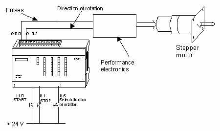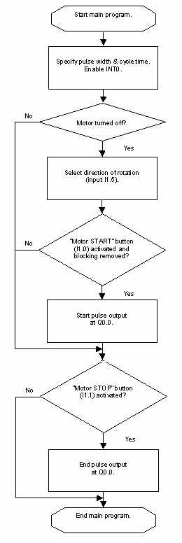 本例敘述用Q0.0的輸出脈沖觸發(fā)步進(jìn)電機(jī)驅(qū)動器。當(dāng)輸入端I1.0發(fā)出"START"信號后,控制器將輸出固定數(shù)目的方波脈沖,使步進(jìn)電機(jī)按對應(yīng)的步數(shù)轉(zhuǎn)動。當(dāng)輸入端I1.1 發(fā)出"STOP"信號后,步進(jìn)電機(jī)停止轉(zhuǎn)動。接在輸入端I1.5的方向開關(guān)位置決定電機(jī)正轉(zhuǎn)或反轉(zhuǎn)。