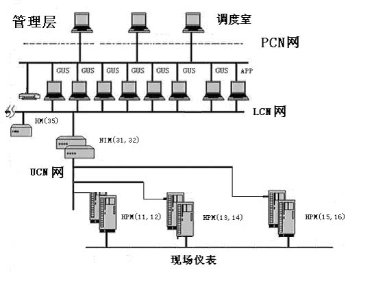 TPS系統(tǒng)主要由GUS(全方位用戶操作站)、HPM(高性能過程管理站)NIM(通訊網(wǎng)絡(luò)接口)、HM(歷史模件)、AM、打印機(jī)和通訊網(wǎng)絡(luò)PCN、LCN、UCN等組成。以我廠TPS系統(tǒng)為例,系統(tǒng)配置圖如下: