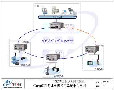 由于該污水處理廠各站的距離較遠,加之對設備的數(shù)據(jù)交換能力和實時性要求較高,因此選用卓越信通TSC Carat5008FC2系列工業(yè)以太網(wǎng)交換機組成光纖冗余自愈環(huán)網(wǎng),為各站的監(jiān)控、采集數(shù)據(jù)提供了快速冗余的以太網(wǎng)通道。