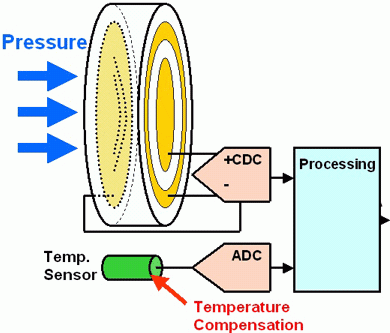 由于熱擴散,溫度傳感器需要考慮改變的幾何形狀。設(shè)想兩個電極中的一個附著在芯片上,另一個附著在由金屬或陶瓷構(gòu)成的支架上,因此支架自己作為傳感器。以陶瓷為例,能夠承受非常高的壓力和侵入的媒介。與經(jīng)典的惠斯通電橋相比較,電容壓力傳感器的主要優(yōu)點是對輸入電流的要求更低,使得他們特別適合于諸如輪胎壓力控制之類的應(yīng)用。