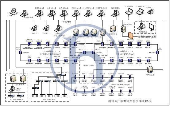 南京梅山鋼鐵廠能源控制系統(tǒng),分區(qū)域采用赫思曼的HIPER-Ring超級(jí)冗余環(huán),環(huán)與環(huán)之間采用環(huán)間冗余的方式進(jìn)行連接,環(huán)網(wǎng)通訊介質(zhì)采用百兆單多模光纖??刂萍?jí)網(wǎng)絡(luò)設(shè)備通過(guò)網(wǎng)關(guān)服務(wù)器與控制中心的操作站、上位機(jī)進(jìn)行通訊。底層的PLC和控制器等設(shè)備通過(guò)現(xiàn)場(chǎng)總線相互通訊。整個(gè)梅山鋼鐵的能源控制系統(tǒng)按分類型、分區(qū)域的三級(jí)網(wǎng)絡(luò)構(gòu)成。